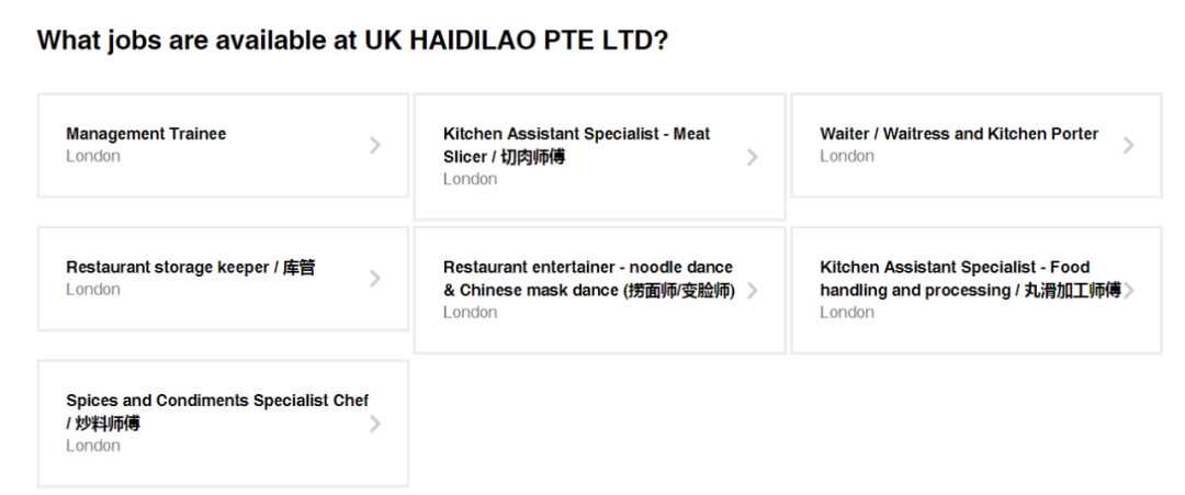 在招聘网站indeed上可以看到,海底捞伦敦餐厅此次招聘七个岗位:管理培训生、店员和厨房伙计、丸滑加工师傅、库管、捞面师/变脸师、切肉师傅、炒料师傅。