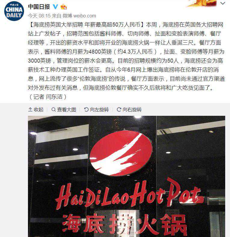 最近,海底捞在英国各大招聘网站上广发帖子,招聘酱料师傅、切肉师傅、捞面和变脸表演师傅……开出的薪资水平跟火锅一样让人垂涎三尺:年薪最高超50万人民币!