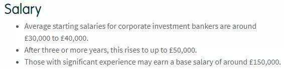 根据英国求职网站prospects的统计,英国corporateinvestmentbanker(企业投资银行家)的第一年起薪一般是4万英镑;三年之后变成5万。