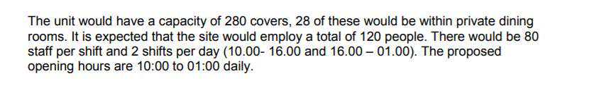 这家海底捞伦敦餐厅为吃货们提供了280个餐位,其中28个餐位位于两个包厢中。提交的营业时间是上午10点到凌晨1点,计划招聘120名员工。