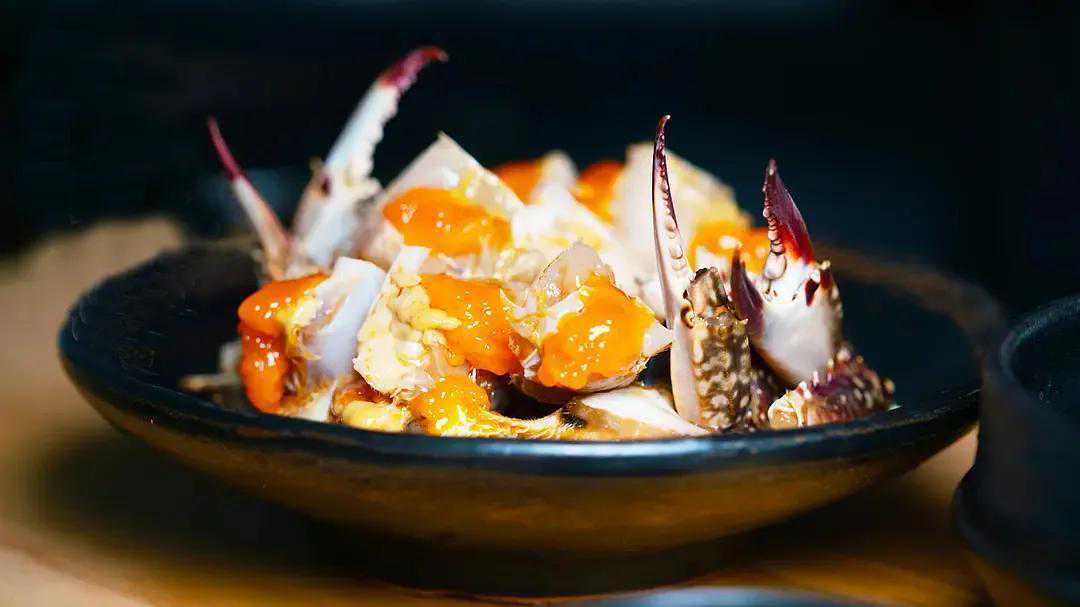 “尝项上之一脔,嚼霜前之两螯。烂樱珠之煎蜜,滃杏酪之蒸羔。蛤半熟以含酒,蟹微生而带糟。盖聚物之天美,以养吾之老饕。”