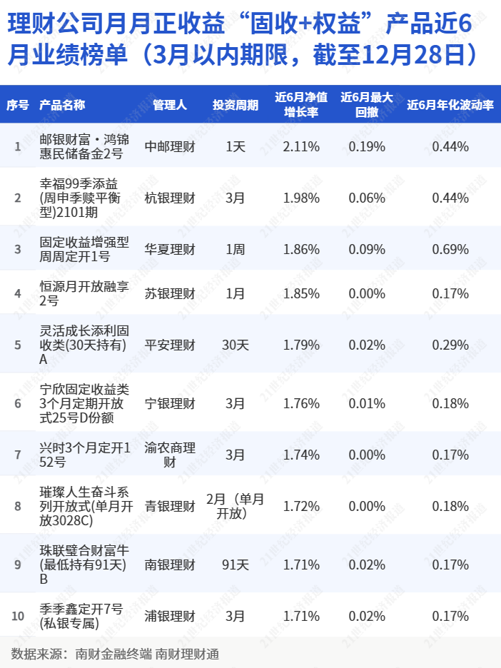 榜单筛选条件:理财公司发行的投资周期在3月以内(含)的公募固收+权益产品,且近6月每个完整的自然月月末均为正收益的产品。另外,同系列同投资周期保留一只。