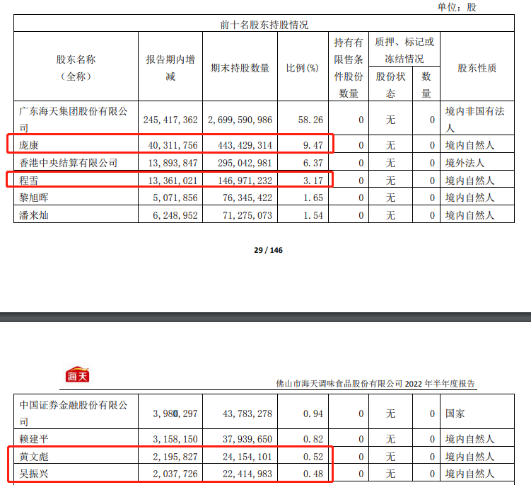 那么庞康等五人到底持有多少海天味业的股份呢?先来看看海天味业2022年半年报中披露的数据,根据财报显示,庞康是海天味业的第二大股东,持有9.47%的股份,共计4.43亿股,程雪持有1.46亿股、黄文彪持有3794万股、吴振兴持有2241万股,陈军阳的持股数量没有披露,根据此前数据推断在900万股左右。