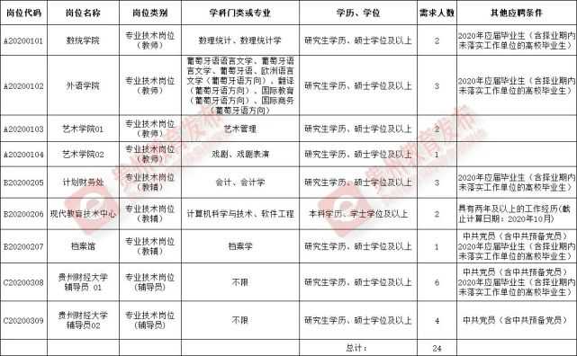 @贵州找工作的小伙伴们一波招聘信息来袭快来看看有没有适合你的?贵州财经大学一、招聘人数:公开招聘工作人员24名,其中,专业技术人员(教师)8名,专业技术人员(教辅)6名,专业技术人员(辅导员)10名。......