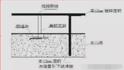 1.首先在屋面结构钢筋绑扎时,从避雷引下线柱钢筋引出Φ12mm镀锌圆钢与屋面避雷带连接,其接点做法见图: