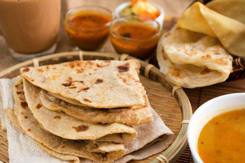 印度薄饼可以和蔬菜或小扁豆一起食用,也可以做成三明治。印度薄饼通常由全麦面粉制成,而且在不加油的情况下烘烤。
