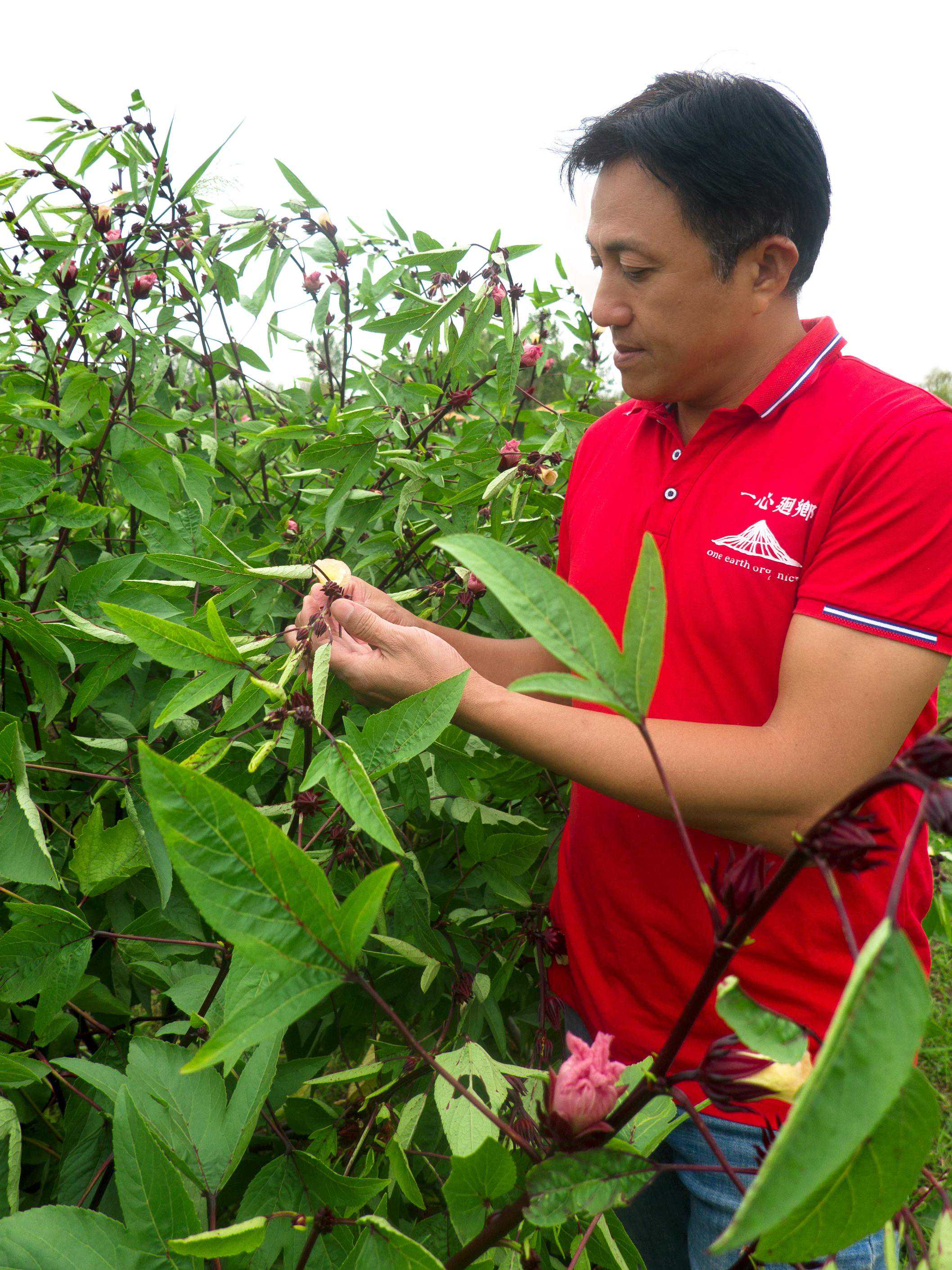 “一心回乡”生态农场负责人蔡三益正在农场的洛神花种植基地劳作。黄陂区融媒体中心黄雨薇摄