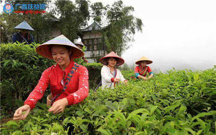 凌云县加尤镇茶山金字塔茶农正在采摘凌云白毫茶春茶。(图源:广西扶贫网)