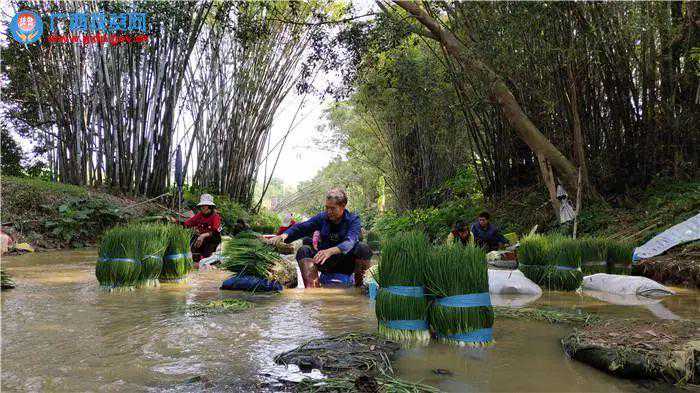 广西灵山县新圩镇邓家村,不单有着“千年香荔”之村的美誉,而且还是全县种葱第一村。图为农户们在江中清洗整理香葱。(图源:广西扶贫网)