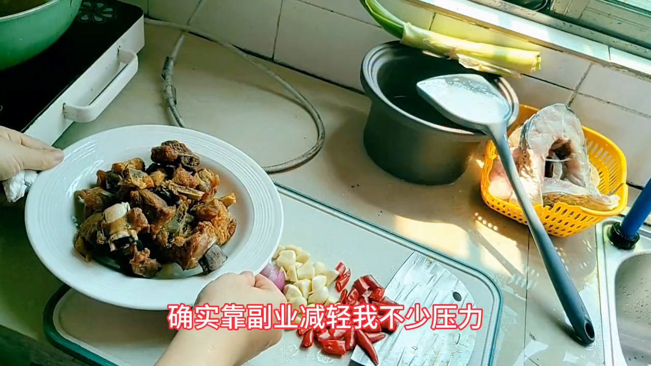 今天中午吃鱼,还炸了一点杂骨,再炒一盘蕨菜。我一个人吃饭很随便,想吃什么做什么,吃不完就当预制菜,平时带去上班吃一点也不浪费。