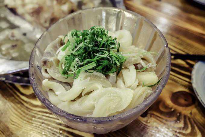 牛鞭其实,就是公牛的生殖器,切成一片片透明的片片;同样也是冰镇后除骚,沾芥末酱油吃,口感脆脆的,壮阳功效很好。