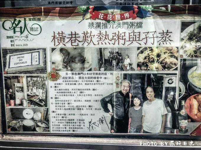 香港美食家蔡澜都称赞过这家广东粥的美味,摊前的玻璃柜贴着蔡澜来用餐与老板的合照。像这种开在消防通道内的“巷仔档”在国内已不多见,所以不得不说这是澳门最独具特色的美食。