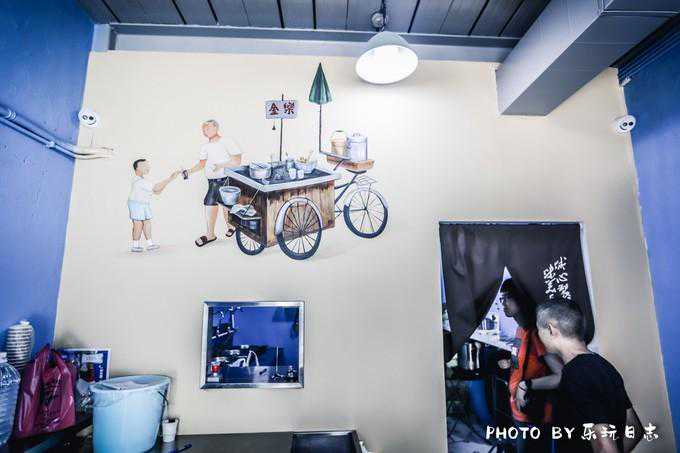 在金乐氹仔外卖店内有幅壁画,上面刻画的内容,正是很多年前,金乐面家始创人林生在街边档摆卖的情况,旁边的小孩便是现在的第二代掌舵人林生。