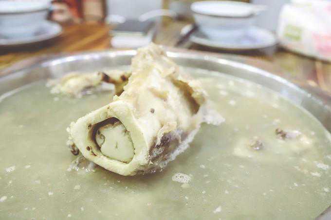 汤底采用五邑秘制牛骨汤,含有丰富的胶原蛋白,女性吃了可以美容嫩肤。牛骨可以看里面很厚的骨髓,配了软管吮吸。这种汤可以促进骨骼与关节的生长,强壮筋骨,所以特别适合儿童和老人饮用。