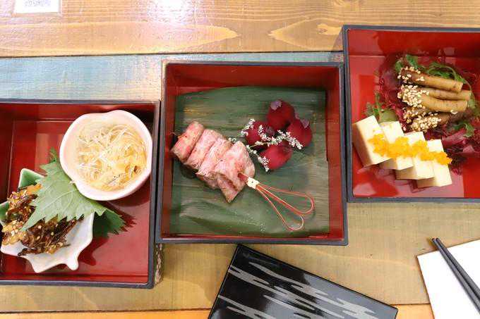餐前小食是牛蒡渍、红酒荞头、蟹味豆腐