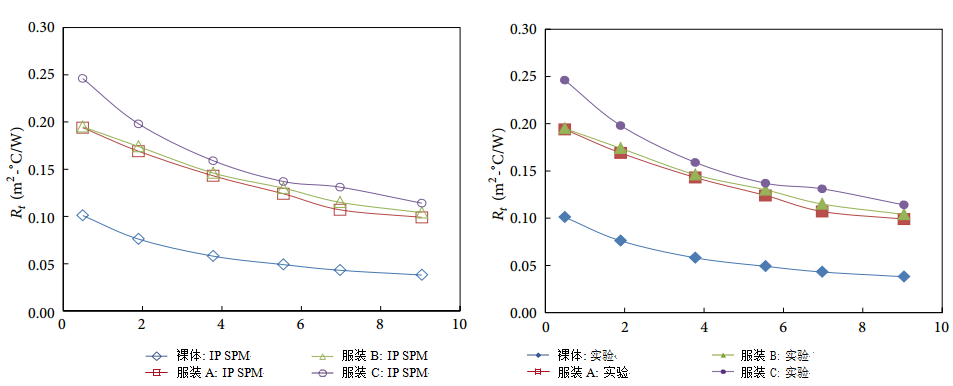 图2显示了IPSPM对暖体假人实验结果在赤身(裸露)条件下和身着三套不同服装条件下,三套服装整体性能排比与IPSPM预测结果完全一致,无论是整体隔热性(如图三所示)还是防水汽扩散(未展示)。这就表明在确切的实验配置不知道或未定义的情况下,IPSPM仍然可使用标准配置值(如衣服贴合性)来确定相关服装的隔热性能排名。