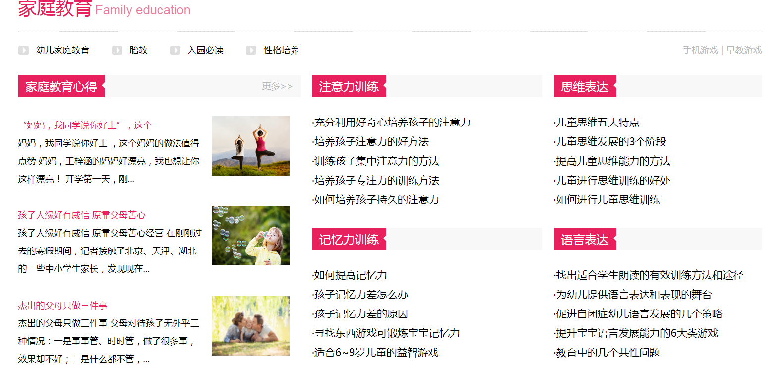这个网站针对0~6岁孩子的生活起居,饮食安排,日常游戏等等都有做详细的参考教案,在家里奶奶妈妈外婆不知道给孩子吃什么,上面都有详细的菜谱。