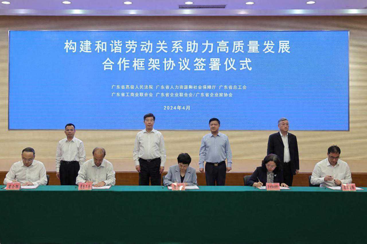南都讯记者赵青通讯员陈康秀陈慧峰4月3日,在广东省高级人民法院党组书记、院长张海波,省人力资源和社会保障厅党组成员、副厅长、一级巡视员杨红山,省总工会一级巡视员张振飚,省工商业联合会党组成员、专职副主席冯日光,省企业联合会会长唐军的共同见证下,五家单位联合签署工作意见(以下简称《意见》),共同推动构建更广覆盖、更全方位、更多层次的和谐劳动关系新机制。