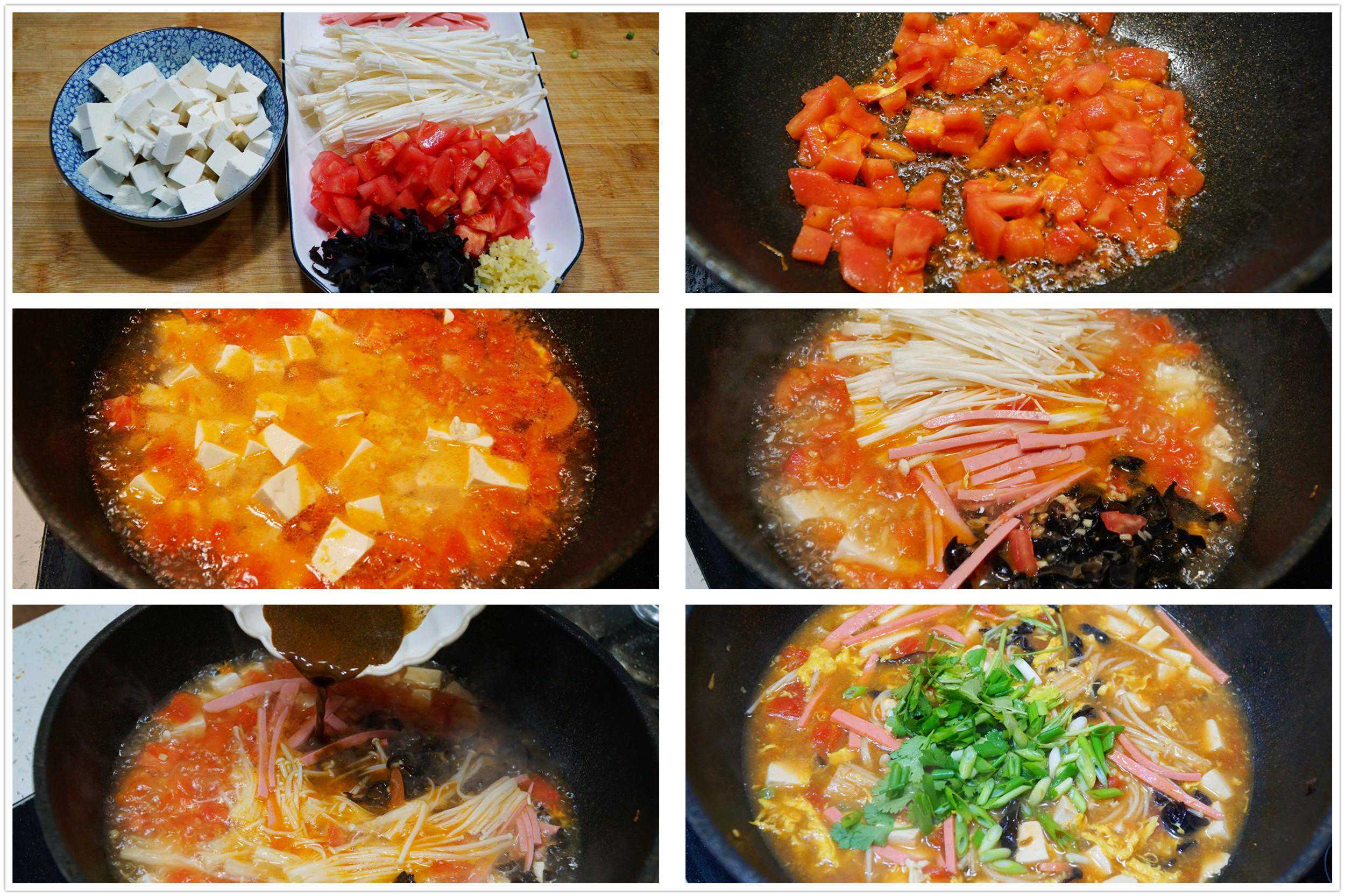 所需食材:嫩豆腐1块、鸡蛋1个、西红柿1个、黑木耳适量、金针菇1小把、火腿肠1根、姜1块、生抽2勺、香醋3勺、淀粉2勺、胡椒粉3调羹、鸡精和食盐适量。