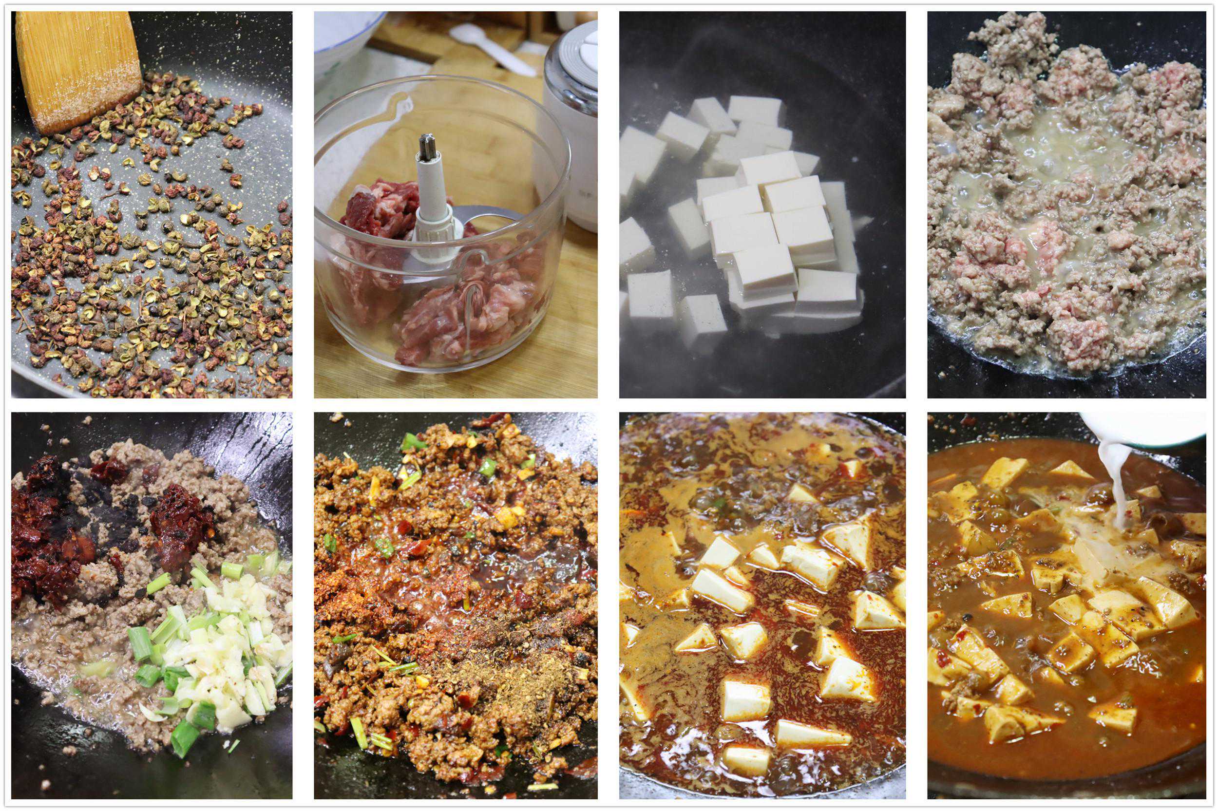 所需食材:牛肉2两、嫩豆腐1块、花椒、麻椒1把、郫县豆瓣酱2勺、豆豉1勺、辣椒粉、蒜苗、大蒜、料酒、食盐、白糖和味精适量。