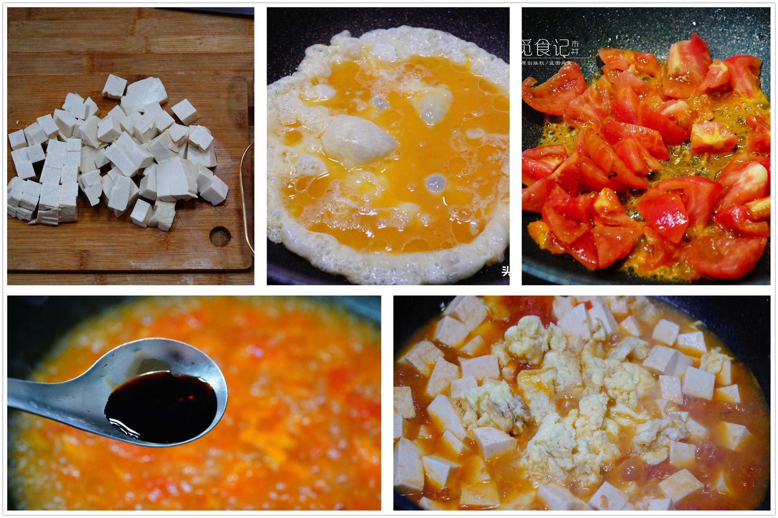 所需食材:番茄3个、嫩豆腐1块、鸡蛋2个、生抽1勺、香醋半勺、芝麻油半勺、食盐、胡椒粉和白糖适量。