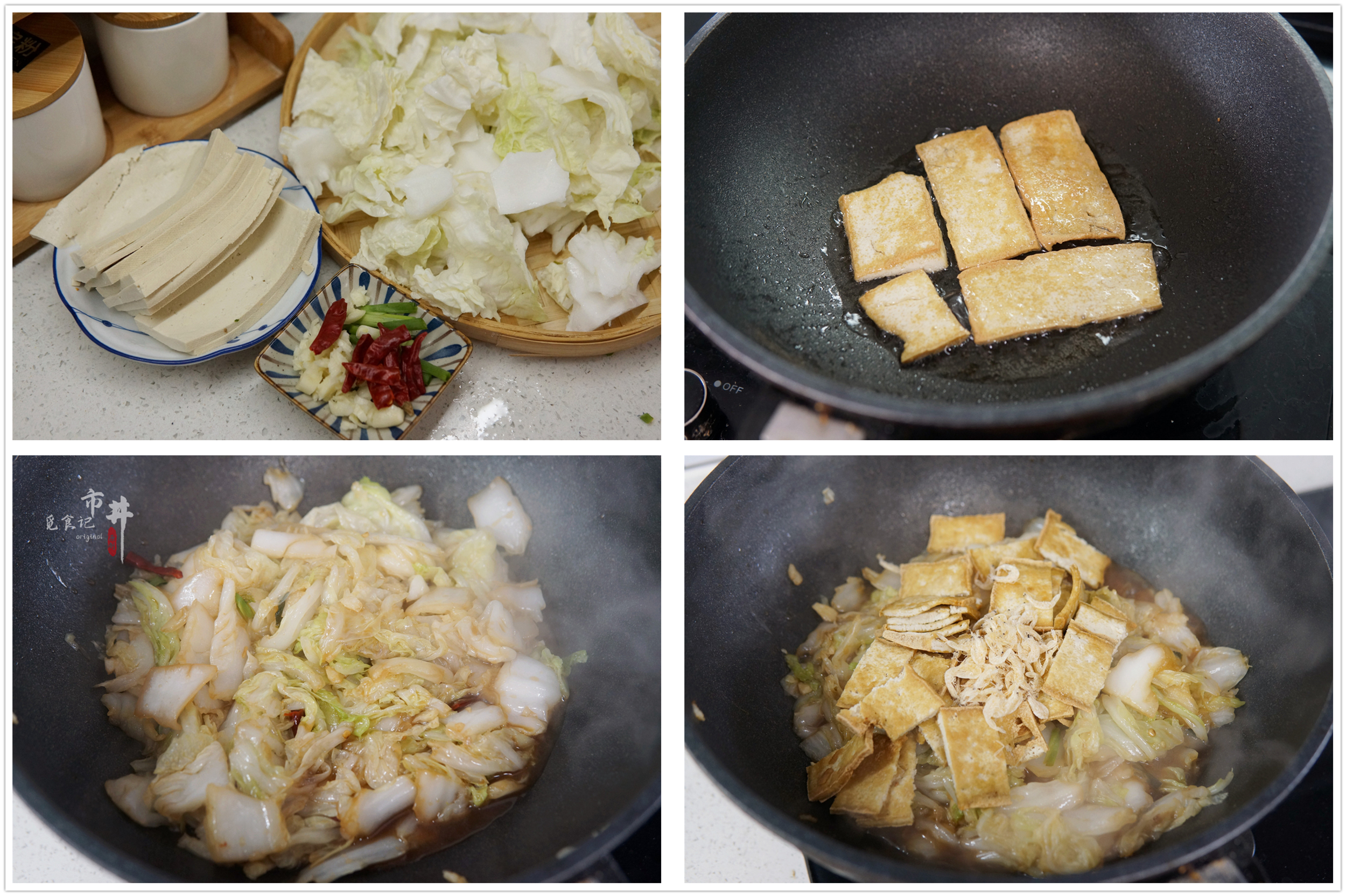 所需食材:豆腐1块、白菜半颗、虾皮1把、大蒜4瓣、干辣椒4根、老抽1勺、生抽2勺、胡椒粉半勺、食盐和鸡精适量。