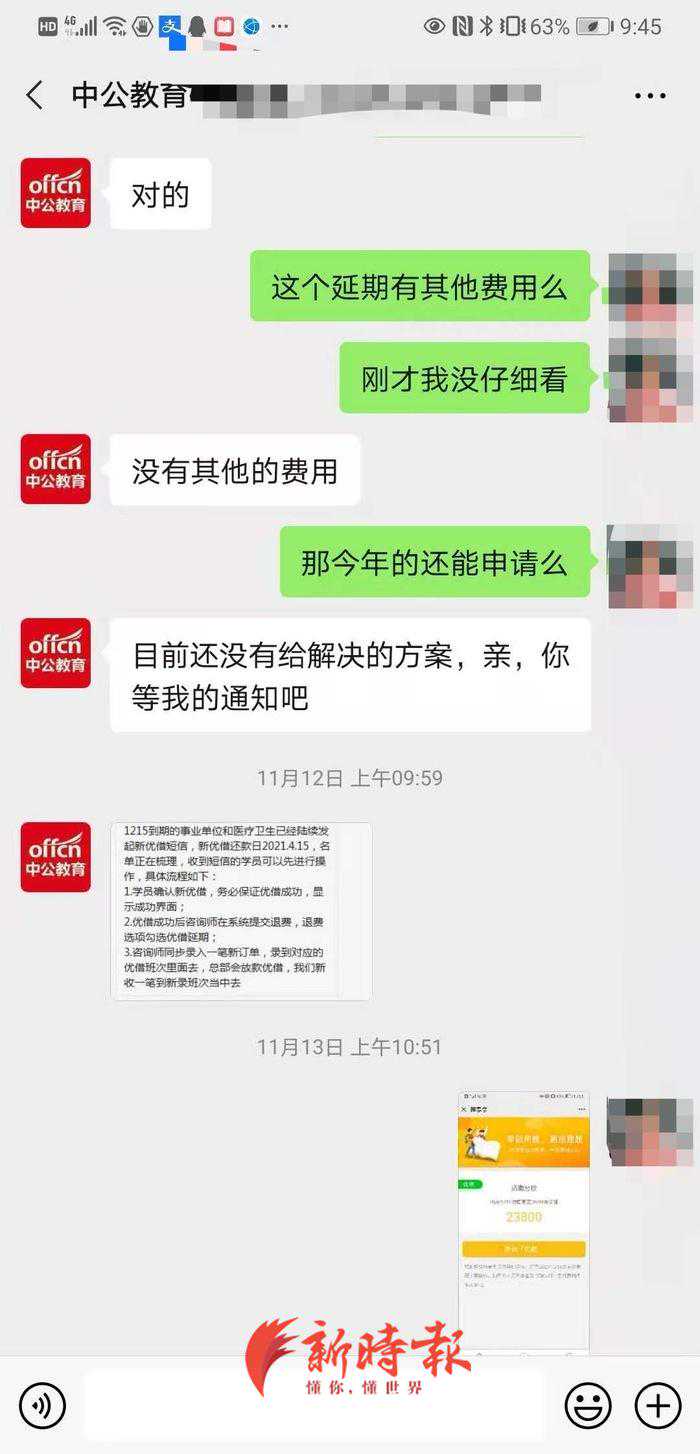 根据张华提供的材料,记者发现11月12日,中公教育济南大学学习中心与张华对接的老师曾发送消息解释张华新收到的“理享学”优借短信,其发送的一张截图信息显示“1215到期的事业单位和医疗卫生已经陆续发起新优借短信,新优借还款日2021.4.15,名单正在梳理,收到短信的学员可以先进行操作,具体流程如下:1.学员确认新优借,务必保证优借成功,显示成功界面;2.优借成功后咨询师在系统提交退费,退费选项勾选优借延期;3.咨询师同步录入一笔新订单,录到对应的优借班次里面去,总部会放款优借,我们新收一笔到新录班次当中去”。