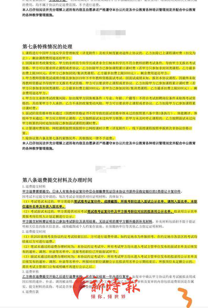 “当时签协议的时候,工作人员就说考不上就给退费,我连面试都没进,肯定是没考上的。”张华说。其与中公教育签订的《山东网校教师招聘笔面全程专用协议》中显示她参加的是中共教育提供的“2020年网校事业部在职师途OAO协议班”。协议中关于“协议考试不过退费标准”中标明的退费条件中显示“按考试主管单位要求参加笔试及相关环节后,本协议约定考试未直接进入面试名单或未能通过调剂、递补、补录、增补等方式进入面试名单,未进入面试环节,认定为甲方笔试未通过,乙方应按约定标准向甲方退费。”
