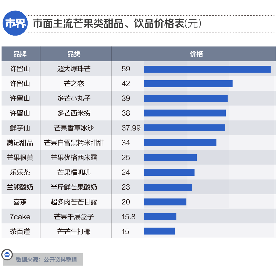「市界」粗略统计,市面上,满记甜品、鲜芋仙、芒果很黄、7cake都有各色的芒果甜品,甚至连饮品界的喜茶们也加入了其中。与之相比,价格上,单品动辄三四十元,甚至最高近60元的许留山,将很多消费者挡在了门外。