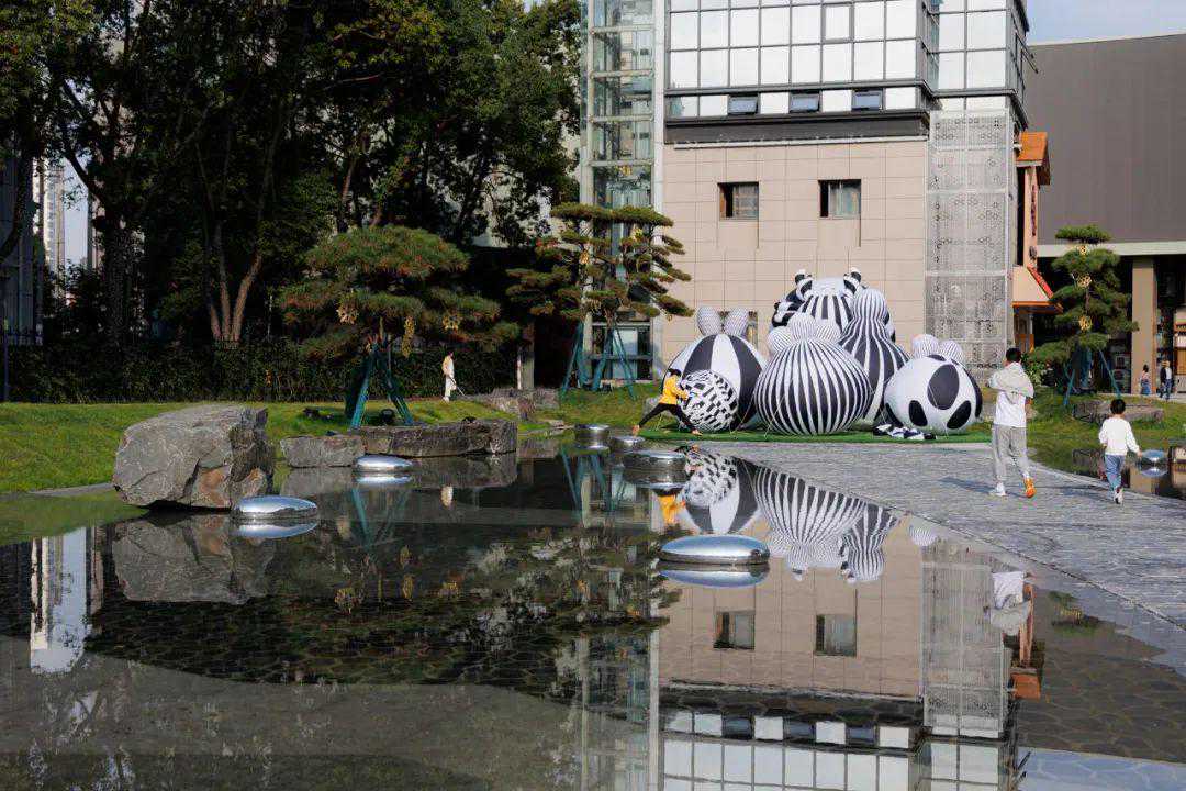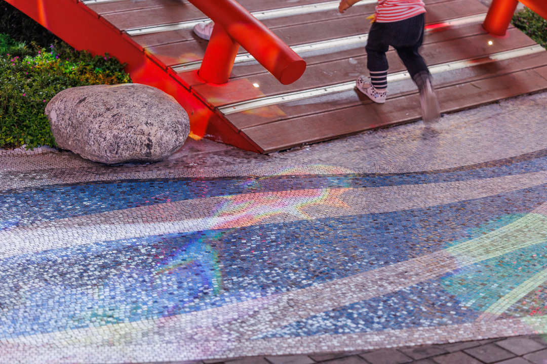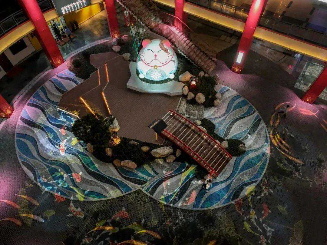 以“锦池”为主题的庭院,将地面铺装与3D投影融合,锦鲤优雅端庄,又灵动可爱。色彩浓烈的锦鲤悠游于风格迥然的鱼池当中,勾勒出多样的意境和画面,增添了场地的动静变化之美。