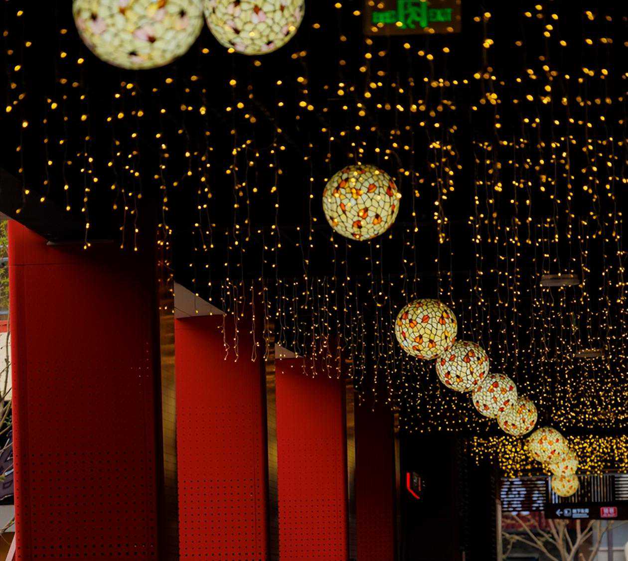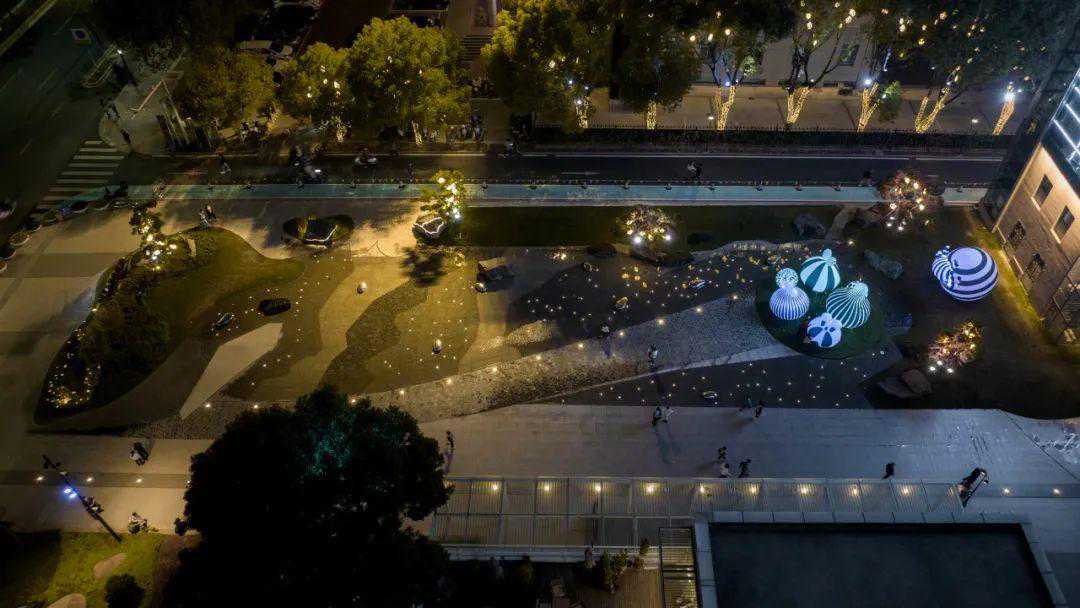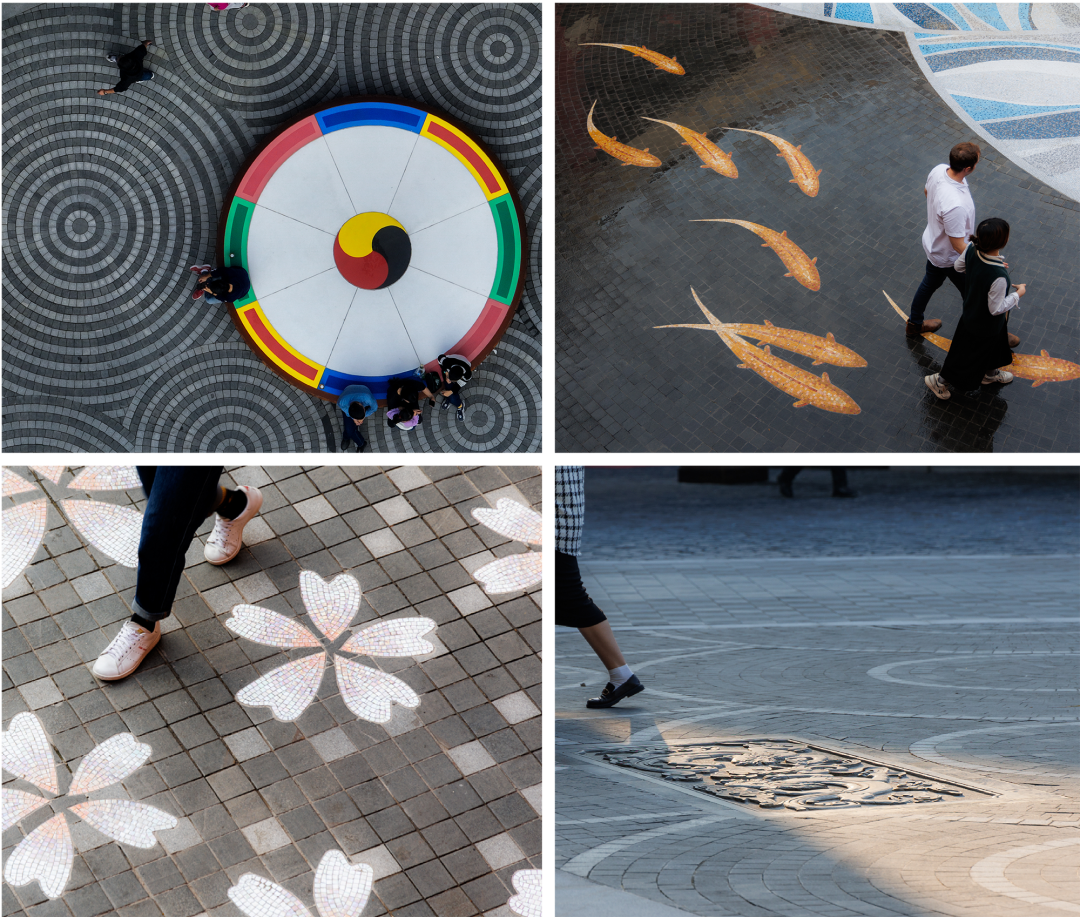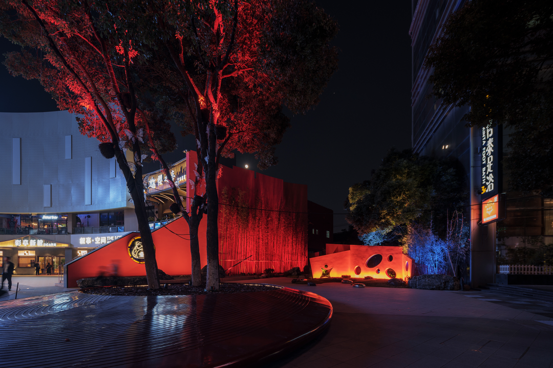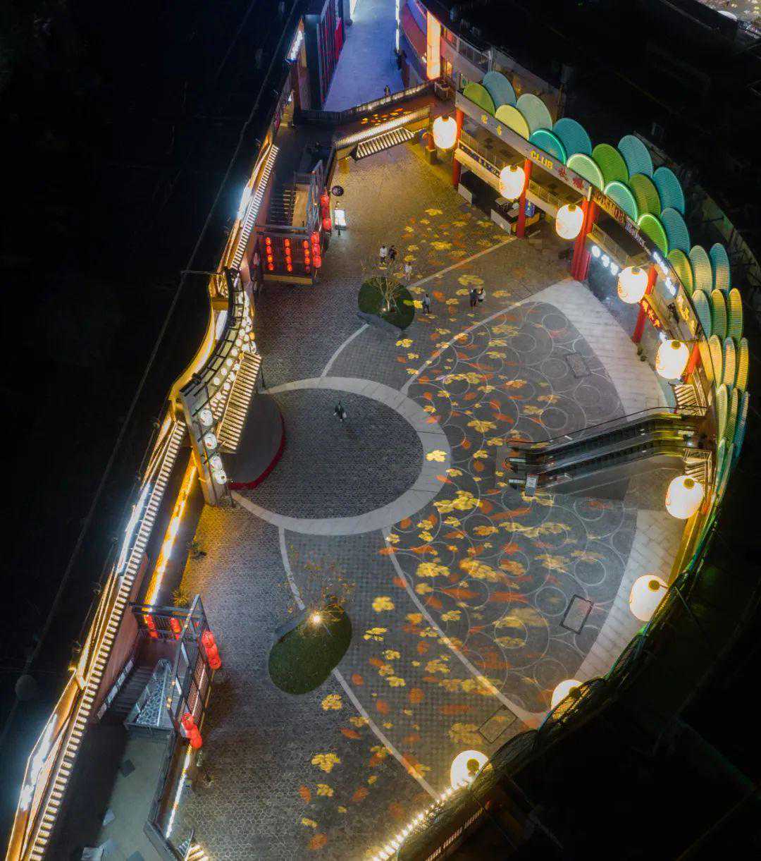 铺装方面,我们尝试突破铺装“边界”概念的框定,通过不同的铺装元素和具有更多色彩的铺装材质选择,配合灯光投影技术,打破原地面的沉闷,令不同场景更具活力与氛围,同时也能增添空间向导性。