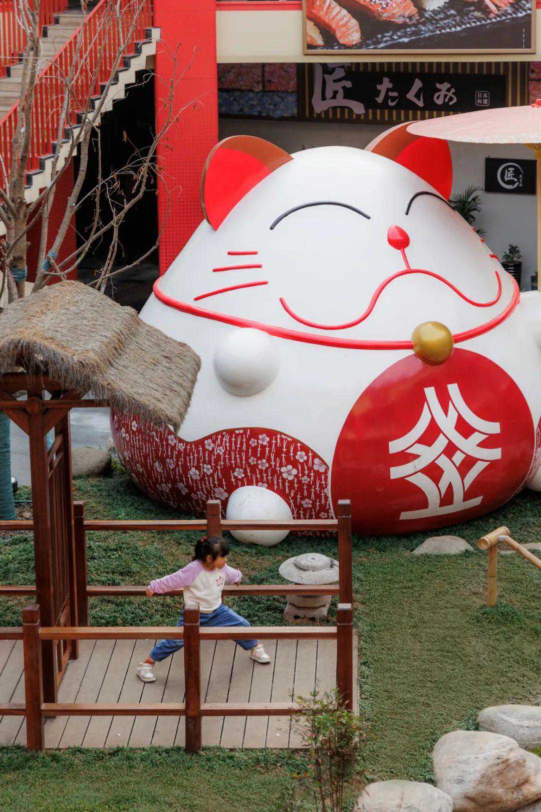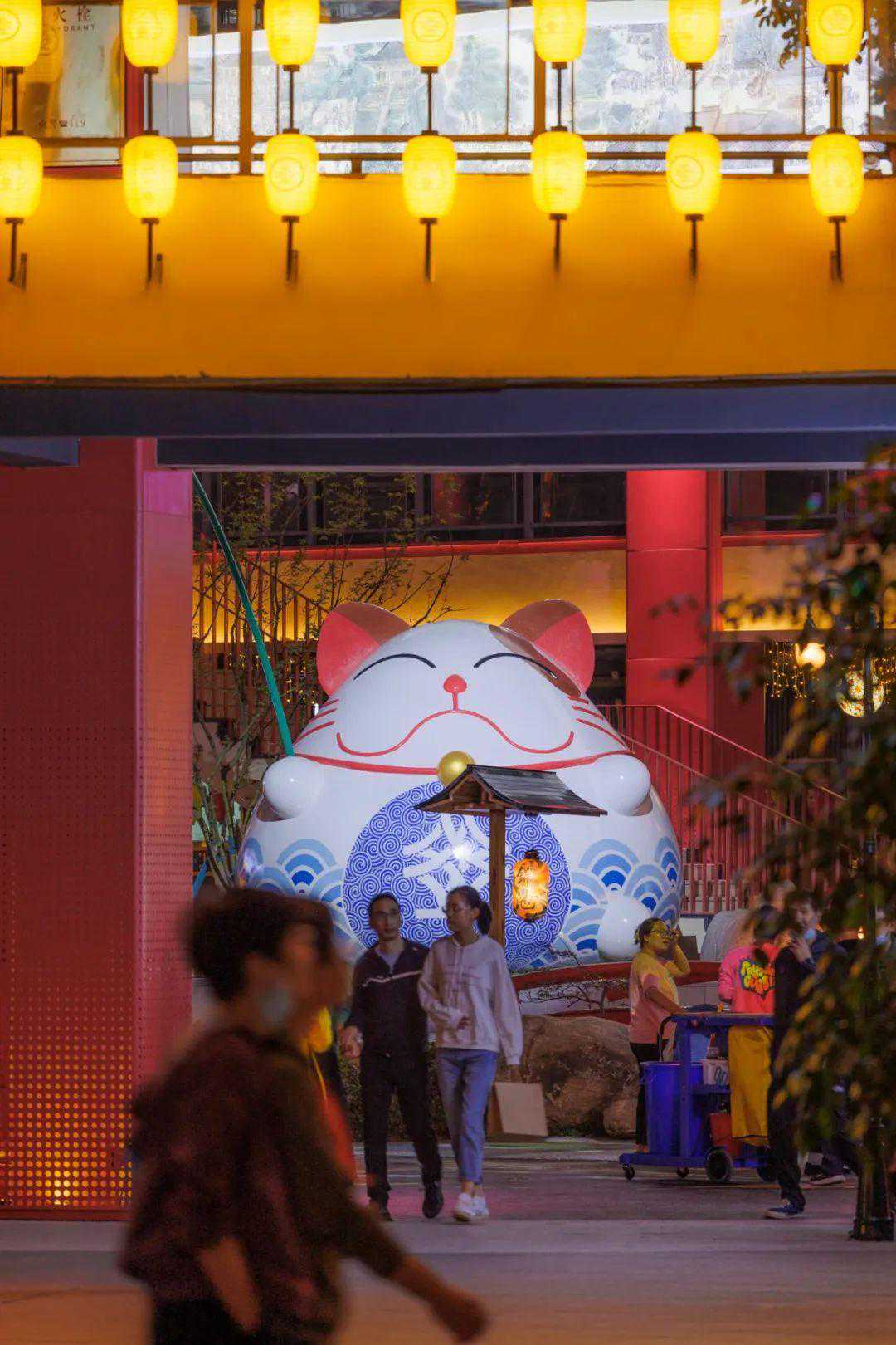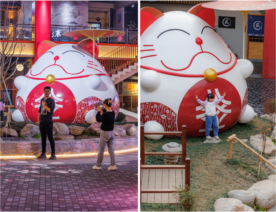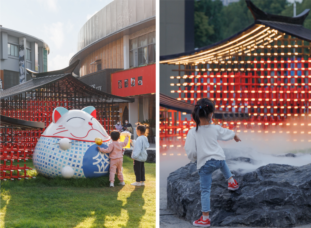 在最初的现状调研中,我们发现片区内的百余家商户中都有着“招财猫”这样的文化符号,于是在设计中我们通过与春夏秋冬的不同活动相结合,塑造了场地IP“阿茂”的形象,它们不仅仅是雕塑,同时在功能上也兼具着现状复杂的隐蔽式设备系统,以此塑造的互娱空间和主题特色极大的丰富了场地的商业氛围。
