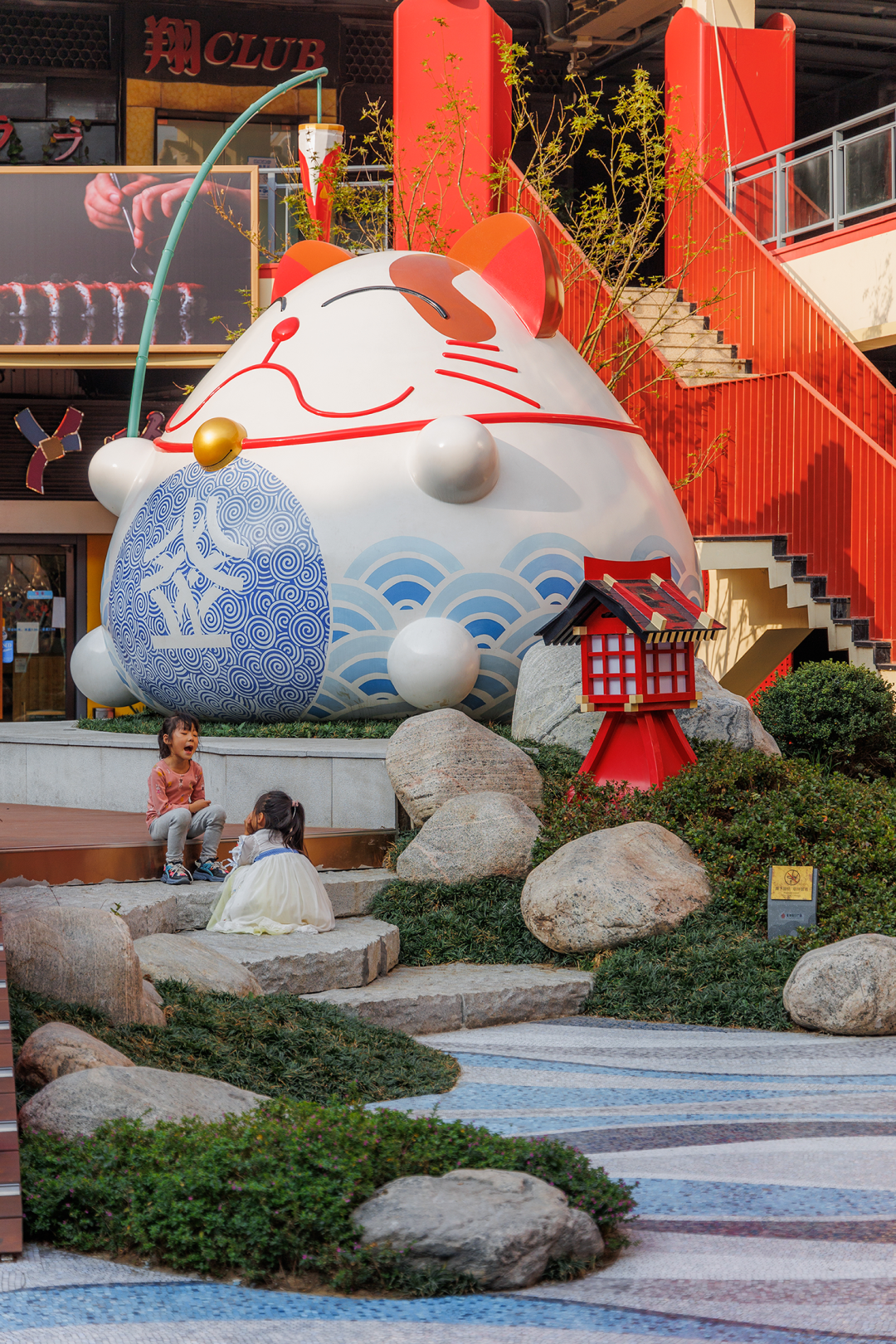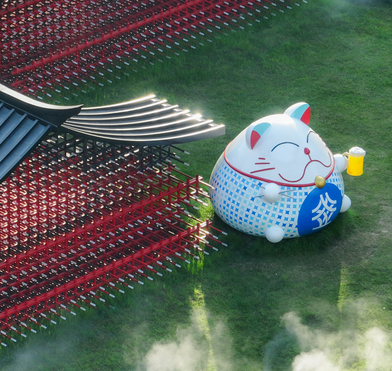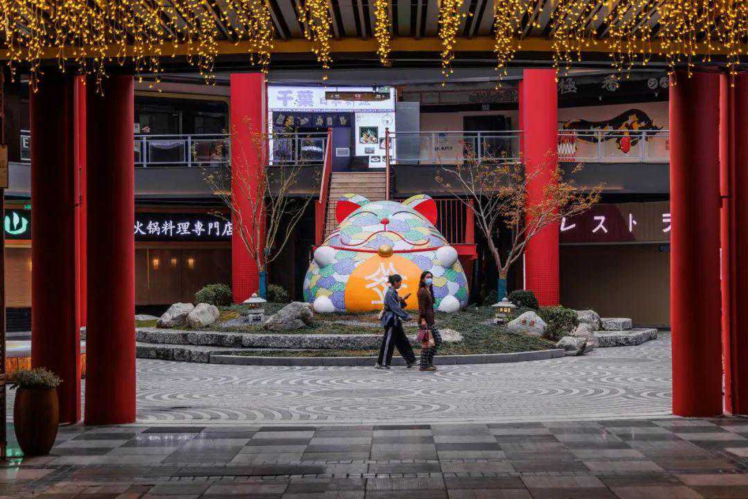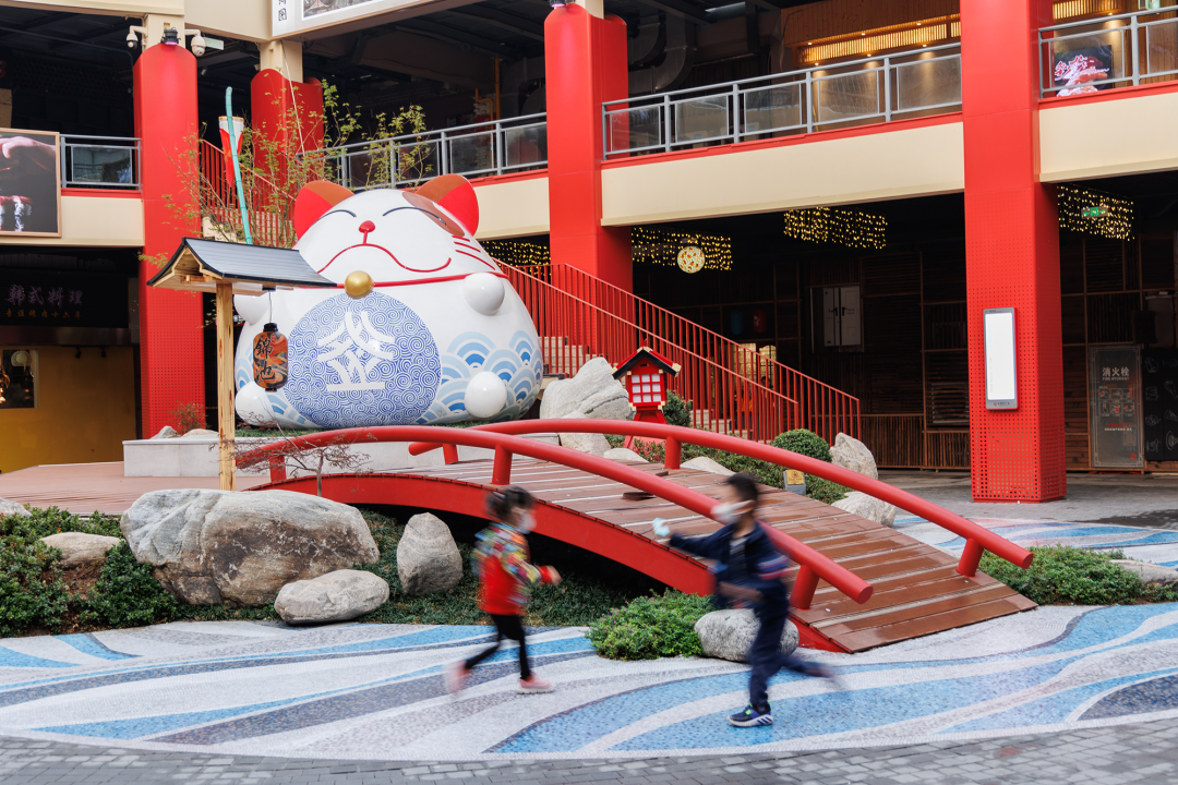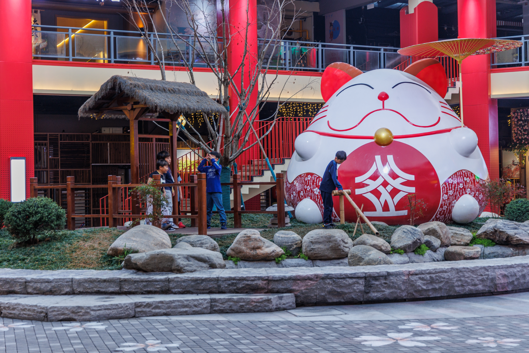 在最初的现状调研中,我们发现片区内的百余家商户中都有着“招财猫”这样的文化符号,于是在设计中我们通过与春夏秋冬的不同活动相结合,塑造了场地IP“阿茂”的形象,它们不仅仅是雕塑,同时在功能上也兼具着现状复杂的隐蔽式设备系统,以此塑造的互娱空间和主题特色极大的丰富了场地的商业氛围。