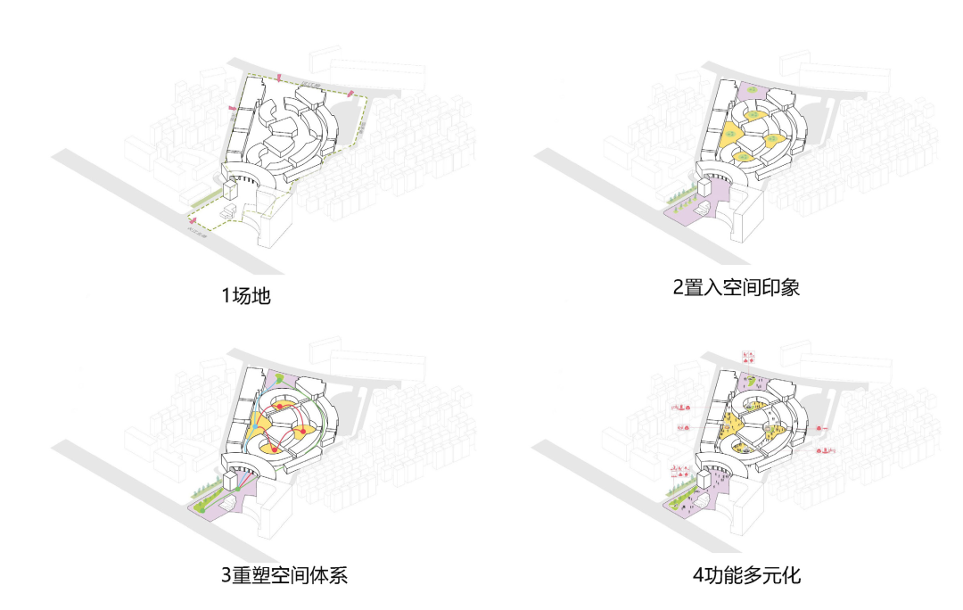 公共空间营造即打破老街区中中庭与广场的单调模式,重新植入活动功能与公共属性,同时满足市民公共需求和街区商业引流。