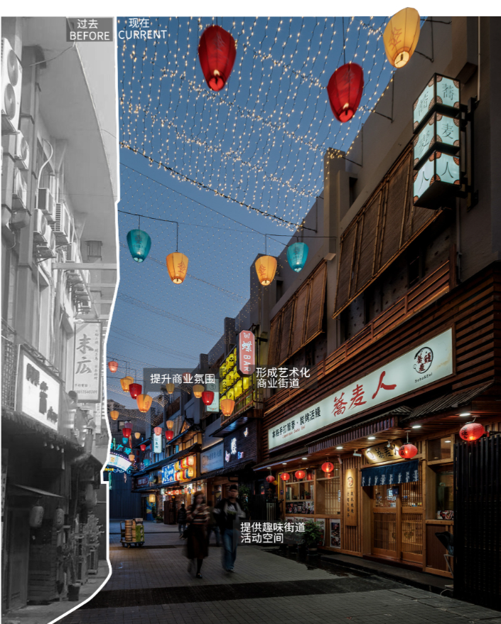 街道立面改造中面临着大量权属不同的独立商家问题,EADG设计团队通过协调主色调、主元素、主标识的基础上,最大程度尊重原商家的立面特色。