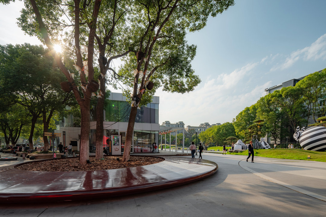 利用在地景观,保留场地内的大香樟。优化树下座椅,整体色彩质感和建筑立面相呼应。