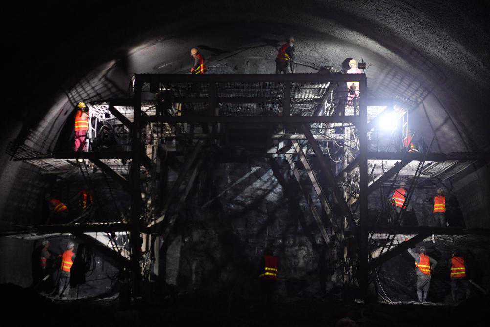1月16日,中铁二十局工人在位于陕西省延安市洛川县的西延高铁伏益隧道施工现场工作。