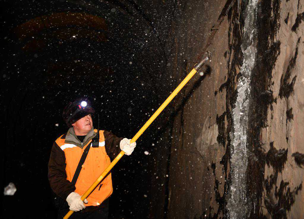 1月28日,中国铁路西安局集团有限公司宝鸡工务段隧道打冰队职工在宝成铁路神砂河3号隧道进行除冰作业。