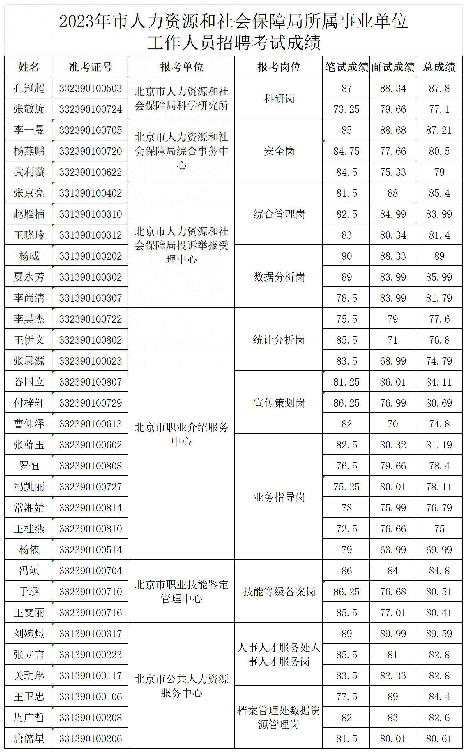 根据《2023年北京市人力资源和社会保障局所属事业单位工作人员招聘公告》及有关要求,北京市人力资源和社会保障局所属事业单位招聘工作人员面试工作结束,现将考试成绩予以公布。