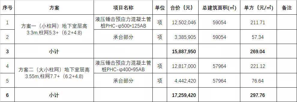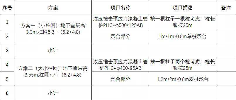 通过上表分析可知,小柱网,地下室层高3.3m,柱网5.3+(6.2+4.8)桩基工程按PHC-φ500*125AB,桩长暂按25m相对于其他更有优势。