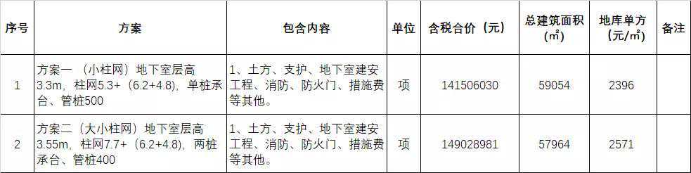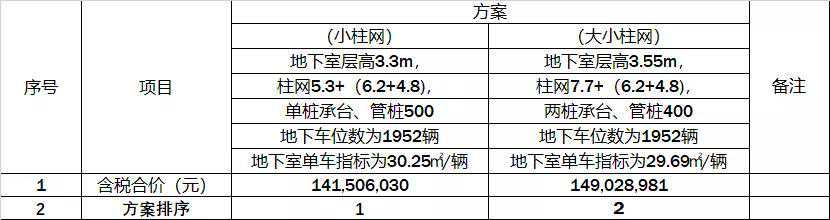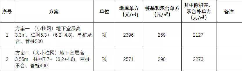 (1)、通过上表分析可知,本地库成本最优的是方案一【小柱网+单桩承台】;