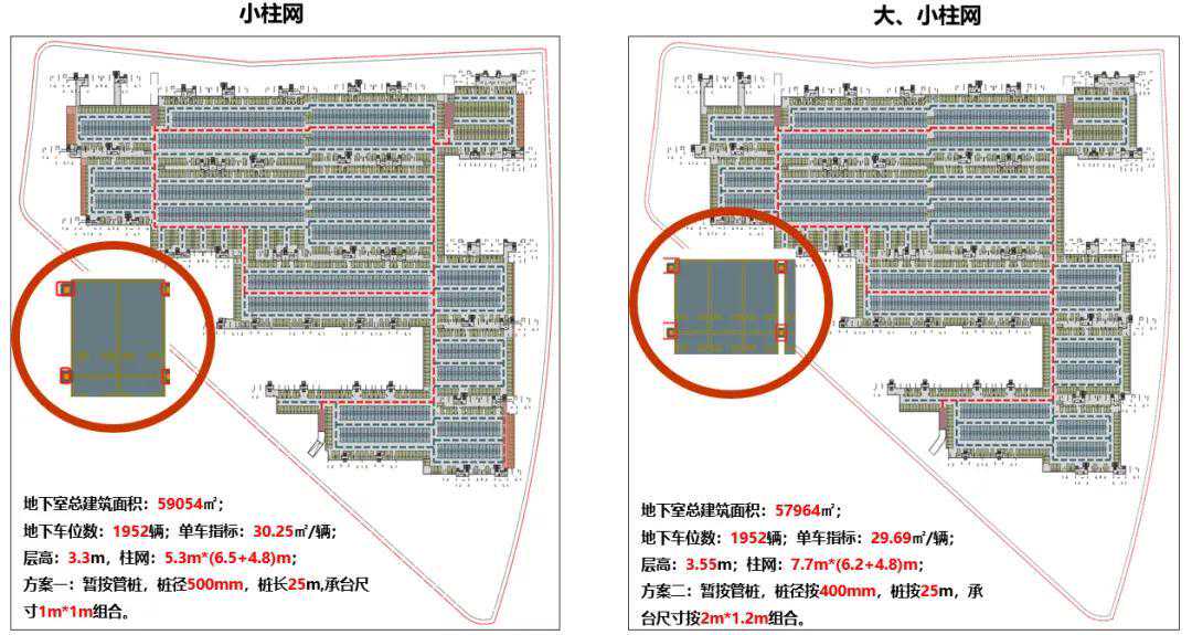 本项目地下室柱网方案选择地下室层高按3.3m,小柱网尺寸为5.3m+(6.2+4.8)m,桩基工程按桩径为500mm,单桩承台尺寸为1m*1m组合,地下车位数为1952辆,地下室单车指标为30.25㎡/辆,总价最低。