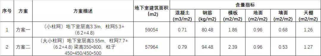 (2)通过上表分析可知,影响小柱网和大小柱网组合差异的主要因素为总包指标含量和桩基及承台部分。