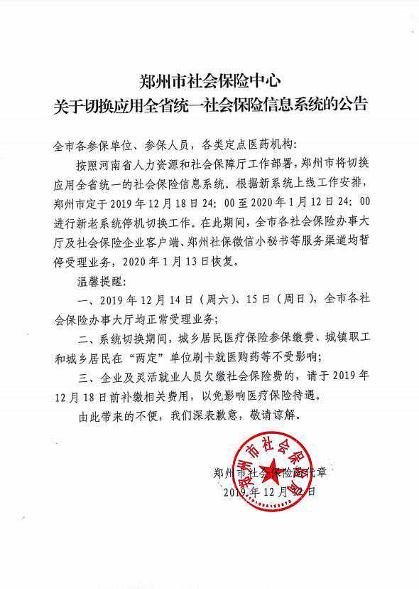 郑州市社会保险中心发布的公告显示,按照河南省人力资源和社会保障厅工作部署,郑州市将切换应用全省统一的社会保险信息系统。根据新系统上线工作安排,郑州市定于2019年12月18日24:00至2020年1月12日24:00进行新老系统停机切换工作。在此期间,全市各社会保险办事大厅及社会保险企业客户端、郑州社保微信小秘书等服务渠道均暂停受理业务,2020年1月13日恢复。