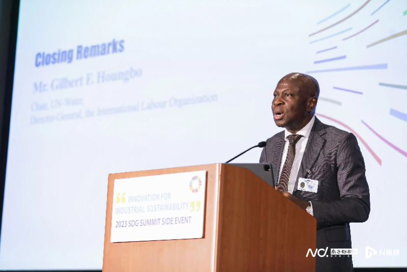 联合国水机制主席、国际劳工组织总干事吉尔贝•福松•洪博()发言。