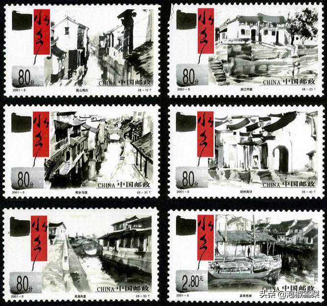 水乡古镇也叫江南水乡,具有悠久的文化历史,最著名的要属周庄、同里、乌镇、西塘,因其沿河环水而建,也被称为“东方威尼斯”。邮票采用泼墨手法,黑白之间彰显古朴神韵,辅以红底书法“水乡”二字,好似一枚印章,与主图相互呼应,俨然一副水乡泼墨画。