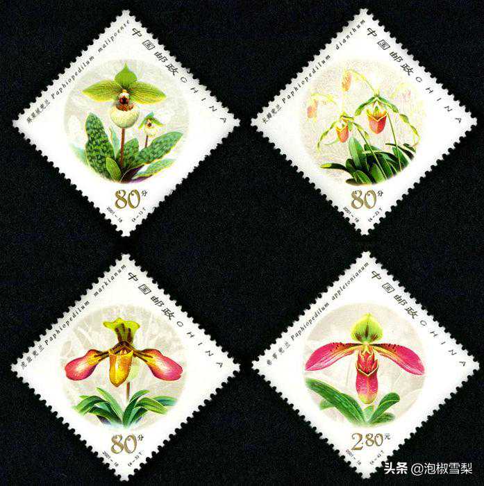 兜兰,属于兰花类,因其花瓣呈兜状故得名。这套邮票也是新中国第一套菱形邮票。兜兰主体与金银色背景交相呼应,色彩运用恰到好处,给人以空谷幽兰之感。