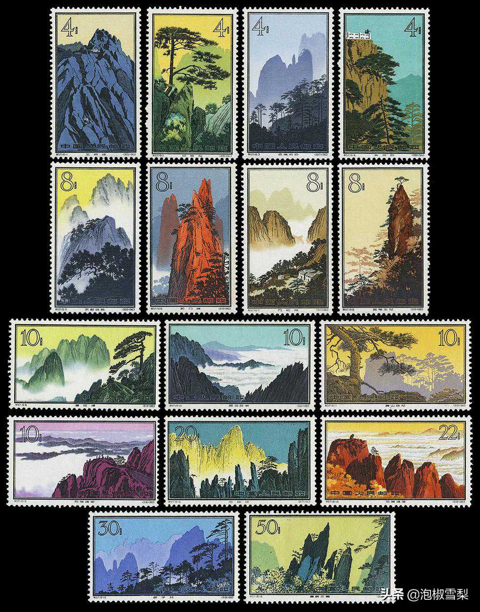 中国第一套大型名山风景邮票,通过影写版的色彩和雕刻版的勾勒,让该套邮票的画面充满层次感,是早年山水邮票中的精品。