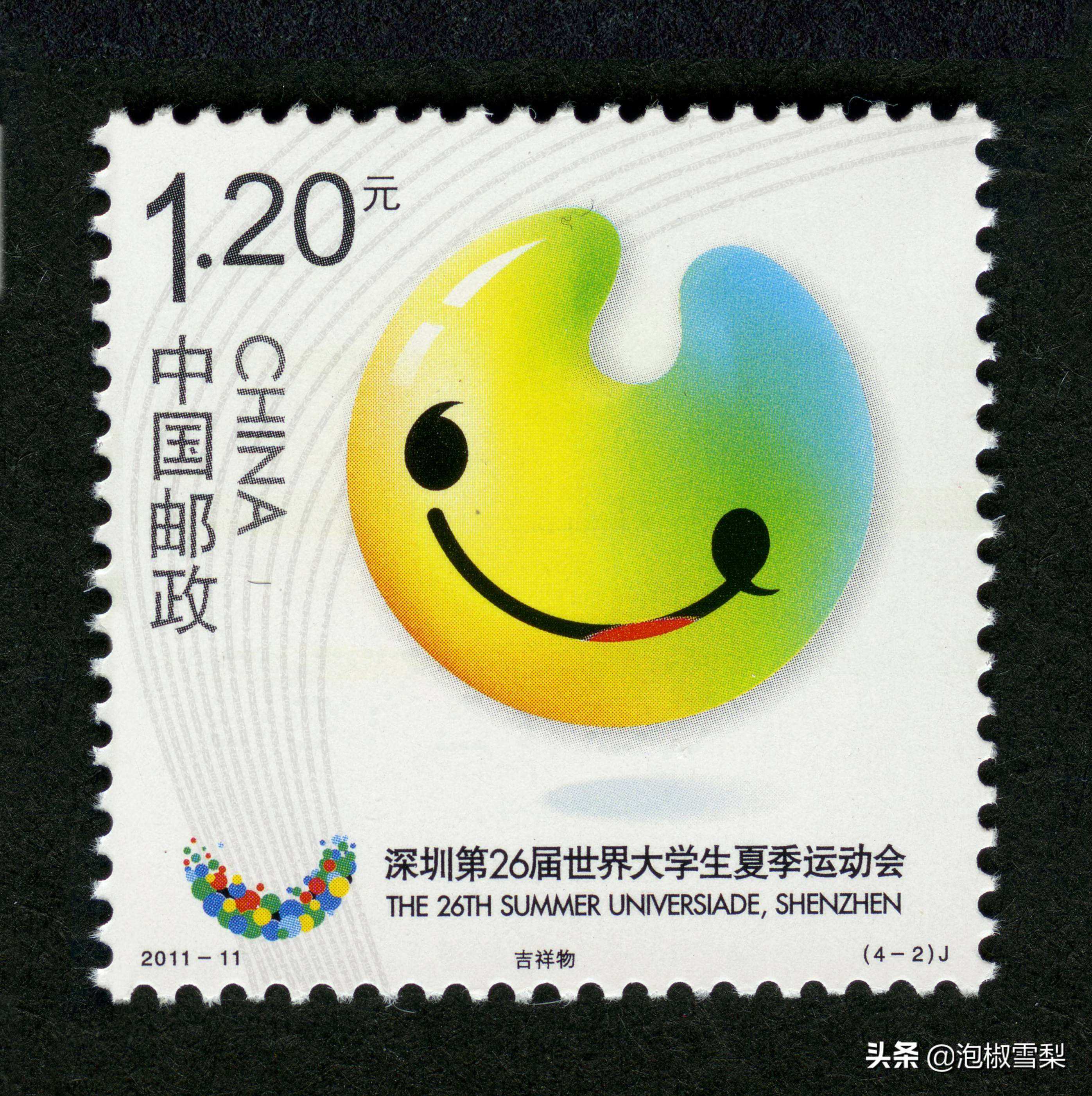 邮票主图为第26届世界大学生夏季运动会吉祥物“UU”,是一张可爱的笑脸,打破了以往运动会吉祥物的写实风格,非常可爱。