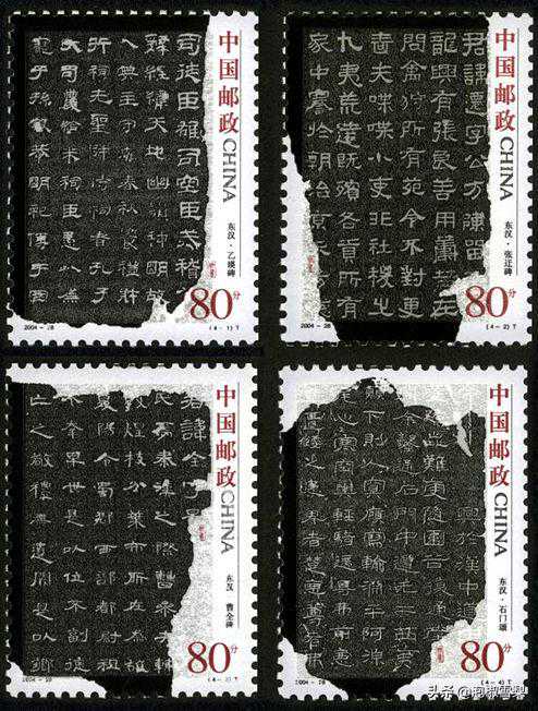 隶书始于秦朝,盛于西汉,在东汉后期趋于鼎盛。邮票使用的是书法史上最有知名度的《乙瑛碑》、《张迁碑》、《曹全碑》、《石门颂》,被称为“汉碑四大名作”。